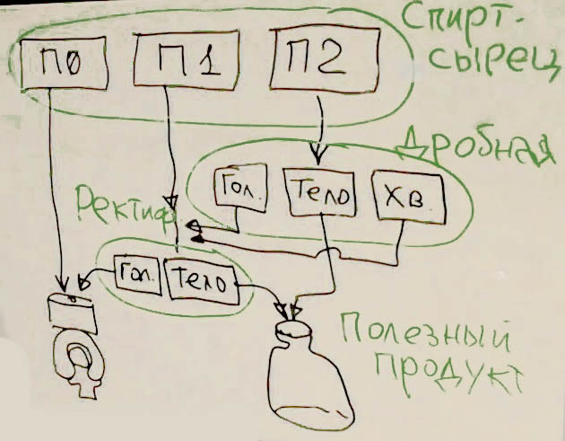 Продукт собирать в разные емкости, отталкиваясь от температуры в кубе, дробить на три части: Тело0, Тело1 и Тело2 (Т0, Т1 и Т2).