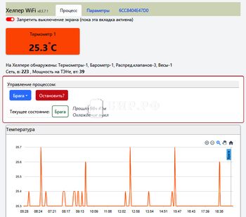 Обратите внимание, что на сайте управления автоматикой Хелпер Wi-Fi в разделе «Параметры» появилась новая закладка «Брага». Теперь винокур может не волноваться, что в помещении, где стоит брага, холодно и брожение может не запуститься. Или наоборот, что в процессе брожения температура браги будет повышаться и выйдет за пределы допустимого. Что бы все это не отвлекало нас от более полезных дел мы подготовили режим удержания температуры браги, в процессе брожения, в диапазоне 25 – 28 градусов. Сначала сделали продолжительность удержания температуры 10 дней, но думаем, что и 7 дней вполне достаточно.