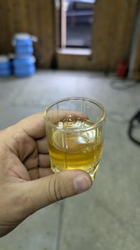 Далее я подумал, а почему бы и углекислоту в ЦКТ не задать. Задал вечером, на утро посмотрел, замутнело %). Снял с дрожжей (перекачал в кегу), поставил на дальнейшую карбонизацию ещё на 3 суток (+2 С), ну и подумал заодно - осветлится может быть. Оказалось ничего подобного, какой то коллоидный раствор получился, в стакане видно, что взвесь плавает из частиц, которые появились после подачи CO2 в ЦКТ, когда дрожжи улеглись на дно ферментера, видимо в этом и заключается ошибка, надо было после колдкраша снять пиво с дрожжей и потом уже карбонить))