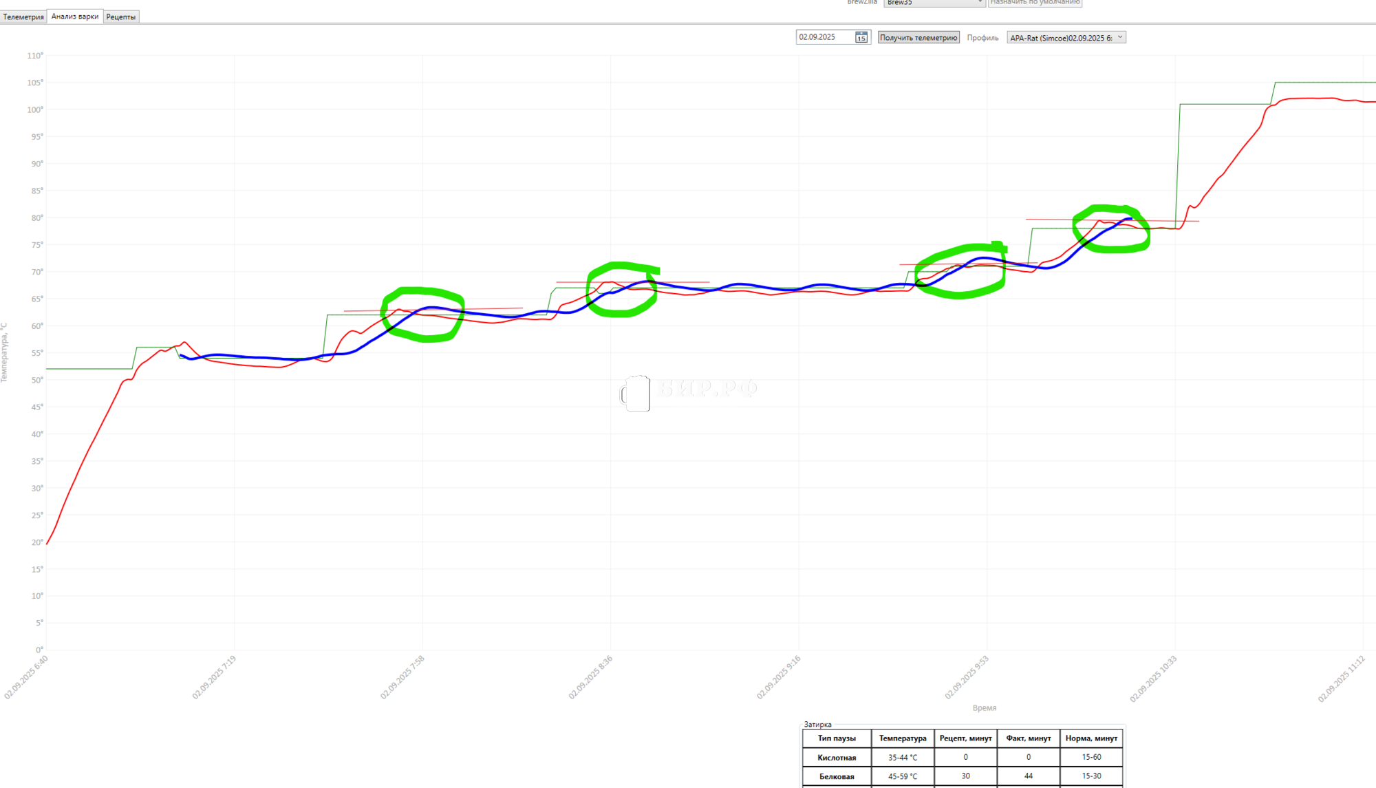 Еще рекомендую в гистерезисе настроить 0,1 градуса и минимизировать мощность на основных паузах, т.о. получается более стабильный прогрев. Некоторым ребятам с форума я уже давал в ЛС такие рекомендации. Для моей BrewZilla35 я держу 35% основная пауза (dif 1°) и 45% прогревочная (в переходах между основными паузами, dif 2°) при мощности насоса около 80%. Такой режим получается более предсказуемым - и постоянным.
