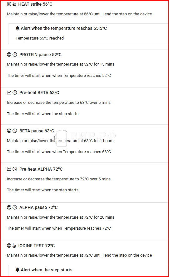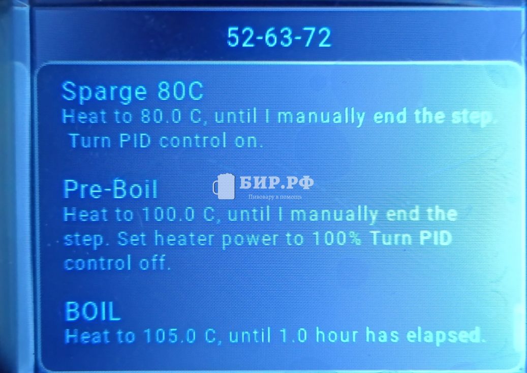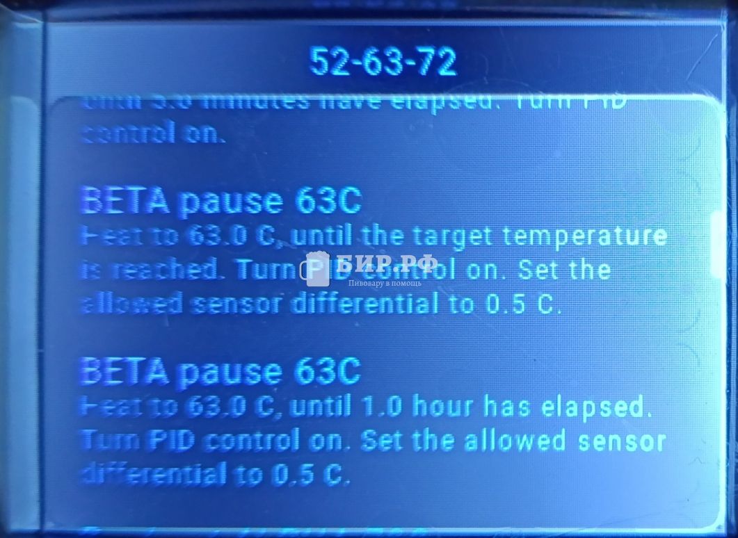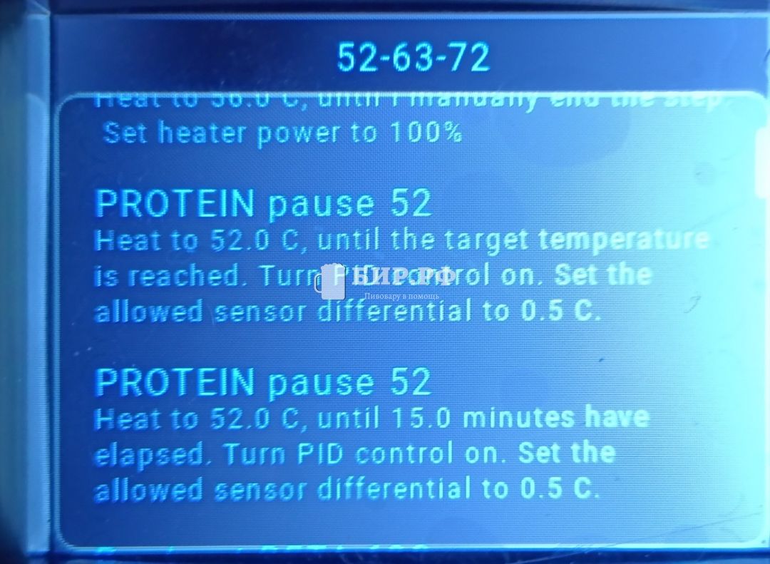 | Дублей бытьне должно точно. Заметил у Вас пару особенностей - Вы задаете десятые доли градусов в dif. - контроллер этогт не поймет, у него шаг 1 градус. На белковой паузе у вас стоит старт таймера по достижению температуры - контроллер может продержать вас дольше на ней - т.е. не стартанет, пока не остынет затор, если после засыпи температура не упадет ниже 52 градусов.Добавлено (2025-09-16, 20:17) --------------------------------------------- Попробуйте разгонные паузы делать на 1 градус меньше - возможно, что контроллеоу не нравится накладни пауз - у Вас на разгонной цель та же, что и в основной паузе, тем самым создается коллизия чтения.