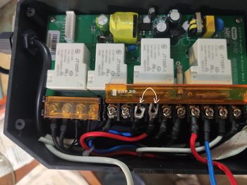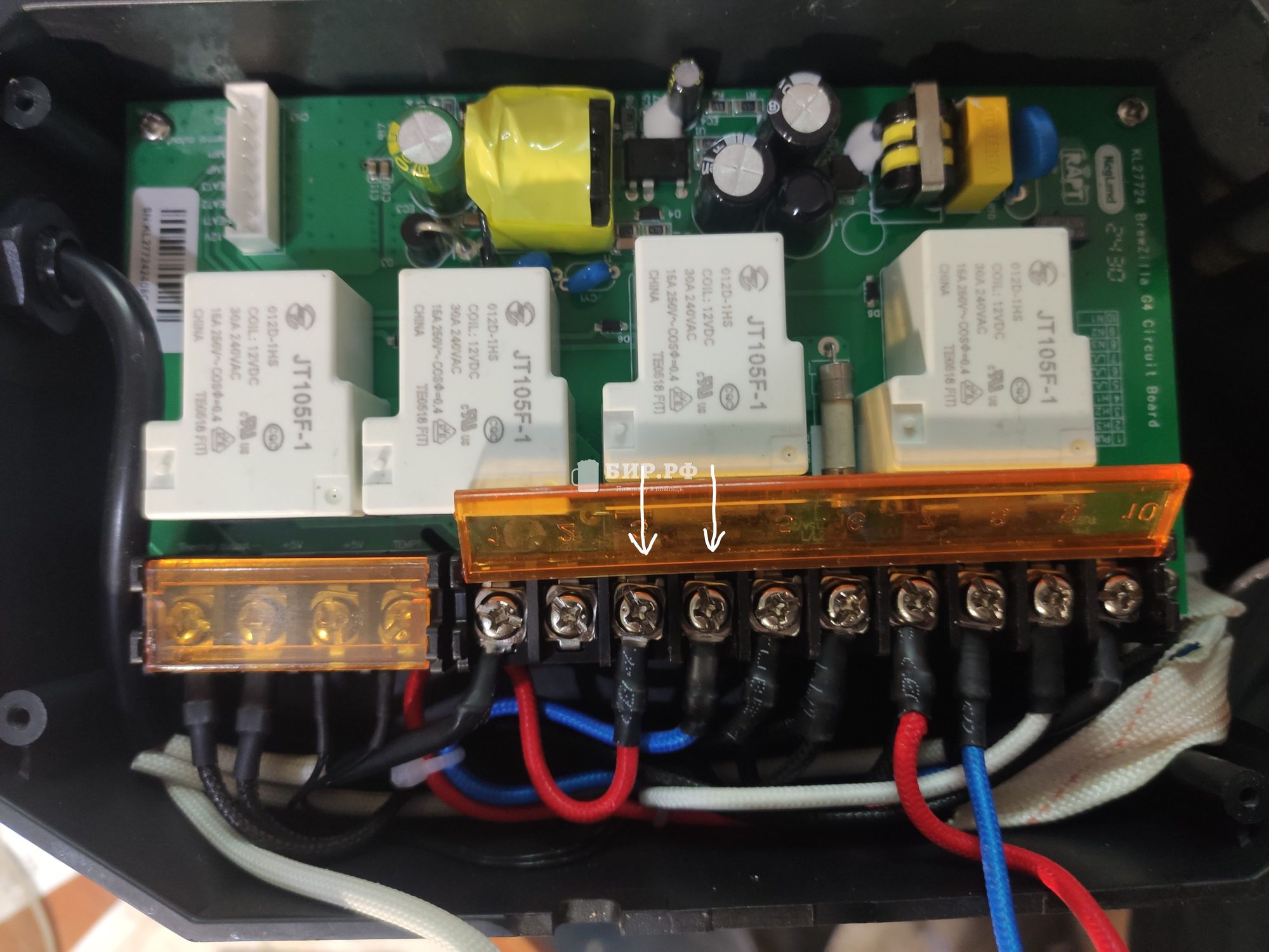 | Наконец разобрался с подключением тэнов. Вот эти два провода надо поменять местами. На этом фото они подключены А здесь уже На мощности 79% должен работать самостоятельно внешний тэн 1700W а на мощности 21% - внутренний 500w.