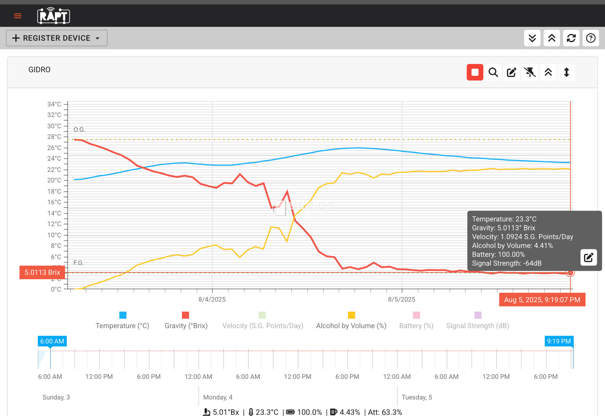 Скорость гравитации (ppd) представляет собой скорость изменения гравитационных точек в день и является мерой того, как быстро гравитация изменяется с течением времени. Этот показатель часто используется в контексте ферментации и пивоварения для отслеживания прогресса в процессе варки пива. Плотность: относится к удельному весу жидкости, такой как сусло или пиво. Точки: относятся к единице измерения плотности. Например, удельный вес \(1,050\) может быть представлен как \(50\) точек плотности. Скорость изменения: показывает, насколько точки плотности увеличиваются или уменьшаются каждый день. Пример: если плотность пива за один день уменьшается с \(1050\) до \(1040\), скорость изменения плотности (ppd) будет равна \(-10\) ppd, что указывает на уменьшение плотности. ------------------------------------------- PS: Показывает динамику падения плотность в более тонком режиме, чтобы видел более точно идёт брожение или нет. Если брать брикс, то там идёт падение только на 1, а тут тебе показывает до 10 000. К примеру у тебя нет ppd и прибор показывает 1.028 SG уже два дня и ты не понимаешь идёт брожение или остановилось по каким-то причинам. А теперь у нас появилась возможность увидеть ppd, и мы видим 1 день у нас плотность упала на -0,00538, второй день на -0,00411 на третий день ты уже увидишь что у тебя будет 1.027 SG. Надеюсь ясно объяснил.