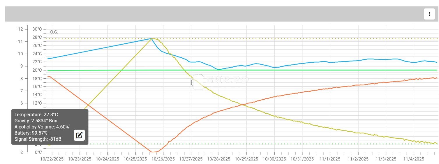Правда калибровал ее пока просто по воде и немного она показания завышает по плотности и температуре но по крайней мере я четко вижу динамику процесса) отбродит пиво и откалибрую уже по двум точкам и температуру поправлю. Видно как пилюля иногда подпрыгивает от пузырей но динамика все равно видна. Фото трех дней брожения приложил.