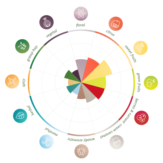 Ароматический профиль: Huell Melon полон фруктов с ароматами дыни, земляники и персикового чая, дополненными сливочными нотками йогурта и травянисто-пряными и цветочными ароматами мелиссы, аниса, лаванды и герани.