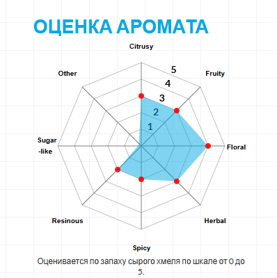 α-кислота: 3.5 %   β-кислота: 5.5 %   Когумулон: 14.5 % от α-кислоты   Масло: 1.1 мг/100г с.в. хмеля