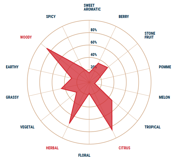 Ароматический профиль: цитрусовый, травяной, пряный, с нотками косточковых фруктов, древесный.