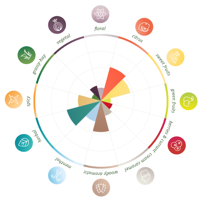 Ароматический профиль: присутствуют ароматы чая в сочетании с компонентами ванили, карамели и абрикосового джема. Их дополняют цветочная хризантема и пряно-травяной шалфей и яснотка. Пряный любисток, черешня и горький грейпфрут завершают ароматический профиль вкуса.