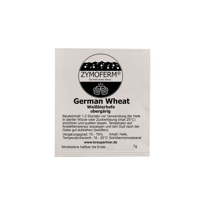 Zymoferm GERMAN WHEAT — классические пшеничные пивные дрожжи верхового брожения. Они подходят для любого типа пшеничного пива, например, Weizen Hell, Kristallweizen, Weizen Dunkel или Weizenbock. Сухие дрожжи GERMAN WHEAT придают пиву бархатистую мягкость и приятное послевкусие, создавая приятные фруктовые ароматы при температуре брожения выше 20°C.
