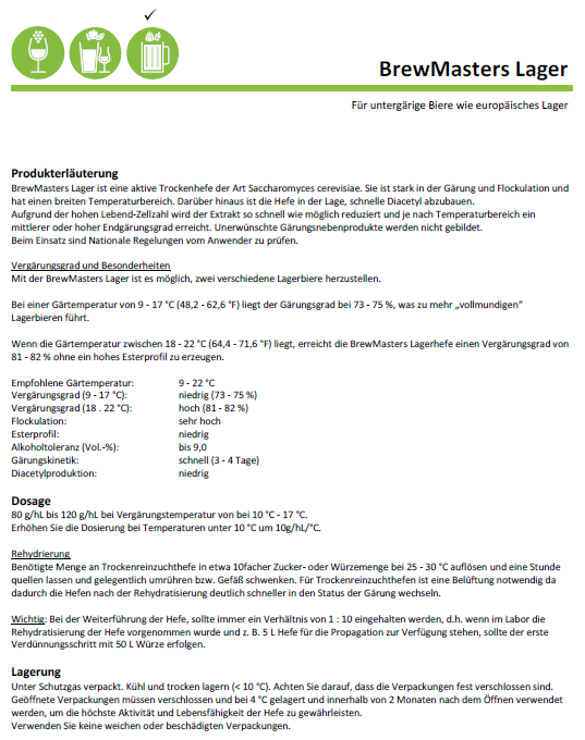 При температуре брожения 18–22 °C дрожжи BrewMasters Lager достигают степени брожения 81–82 % без образования высокого эфирного профиля.