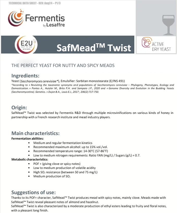 SafMead™ Twist - сухие активные дрожжи вида Saccharomyces cerevisiae, предназначенные для производства медовухи.