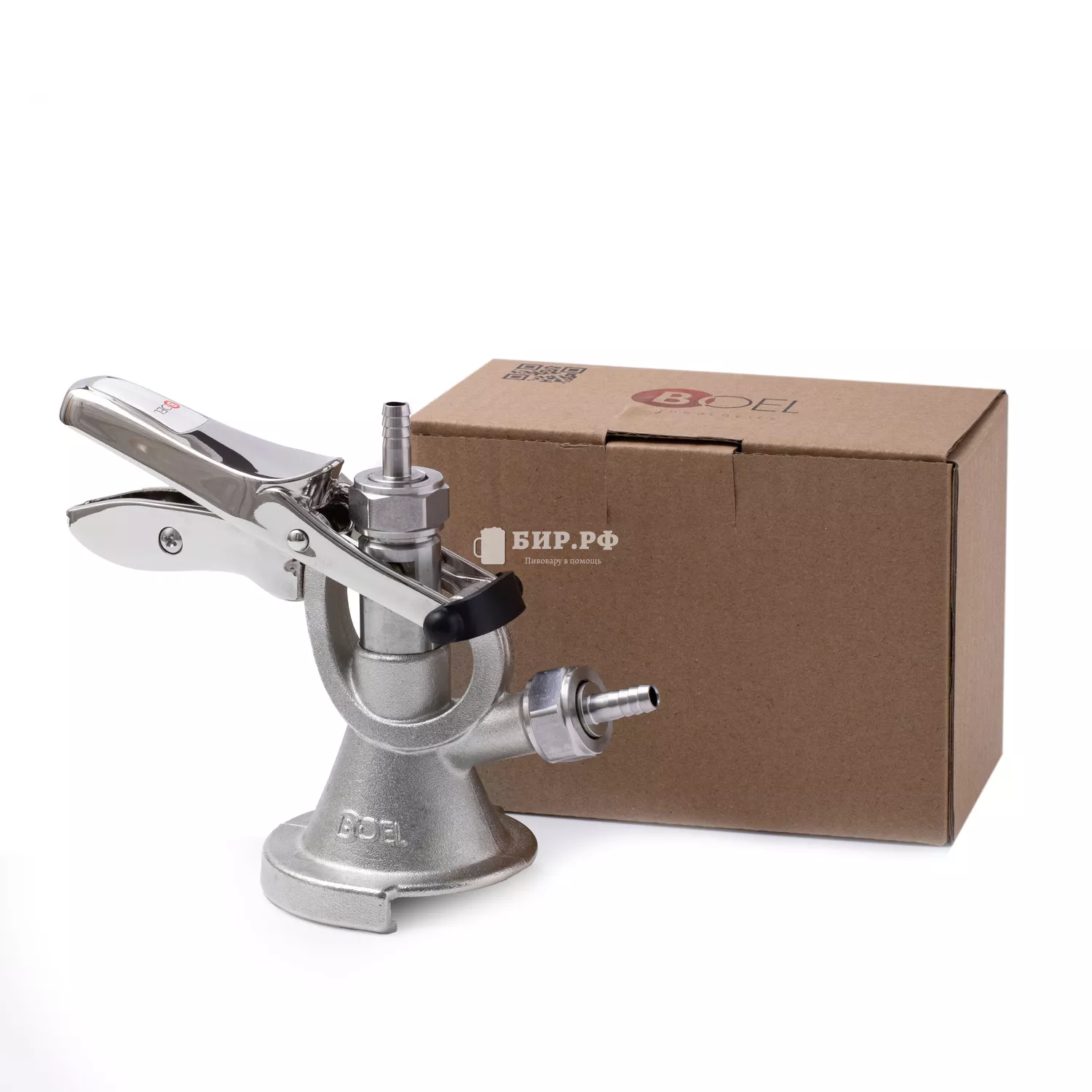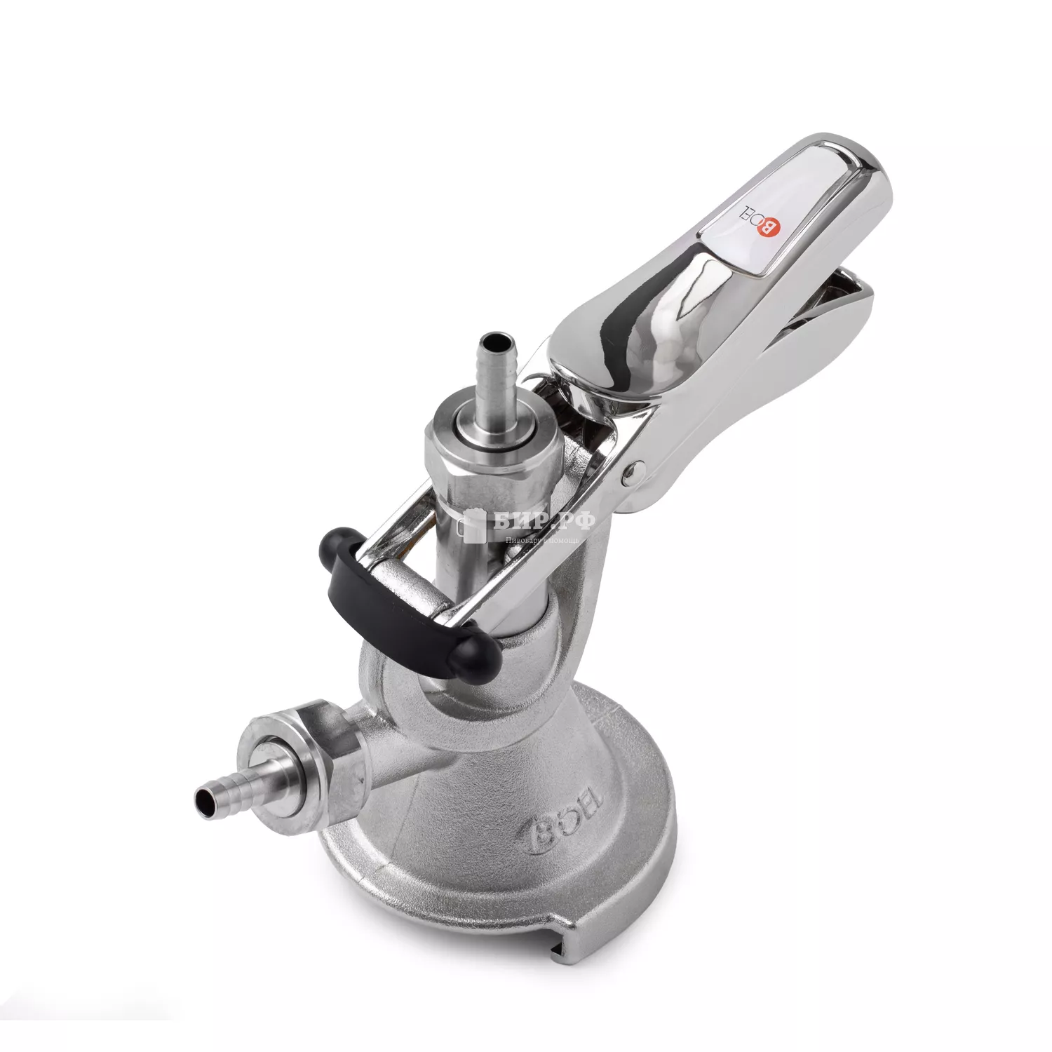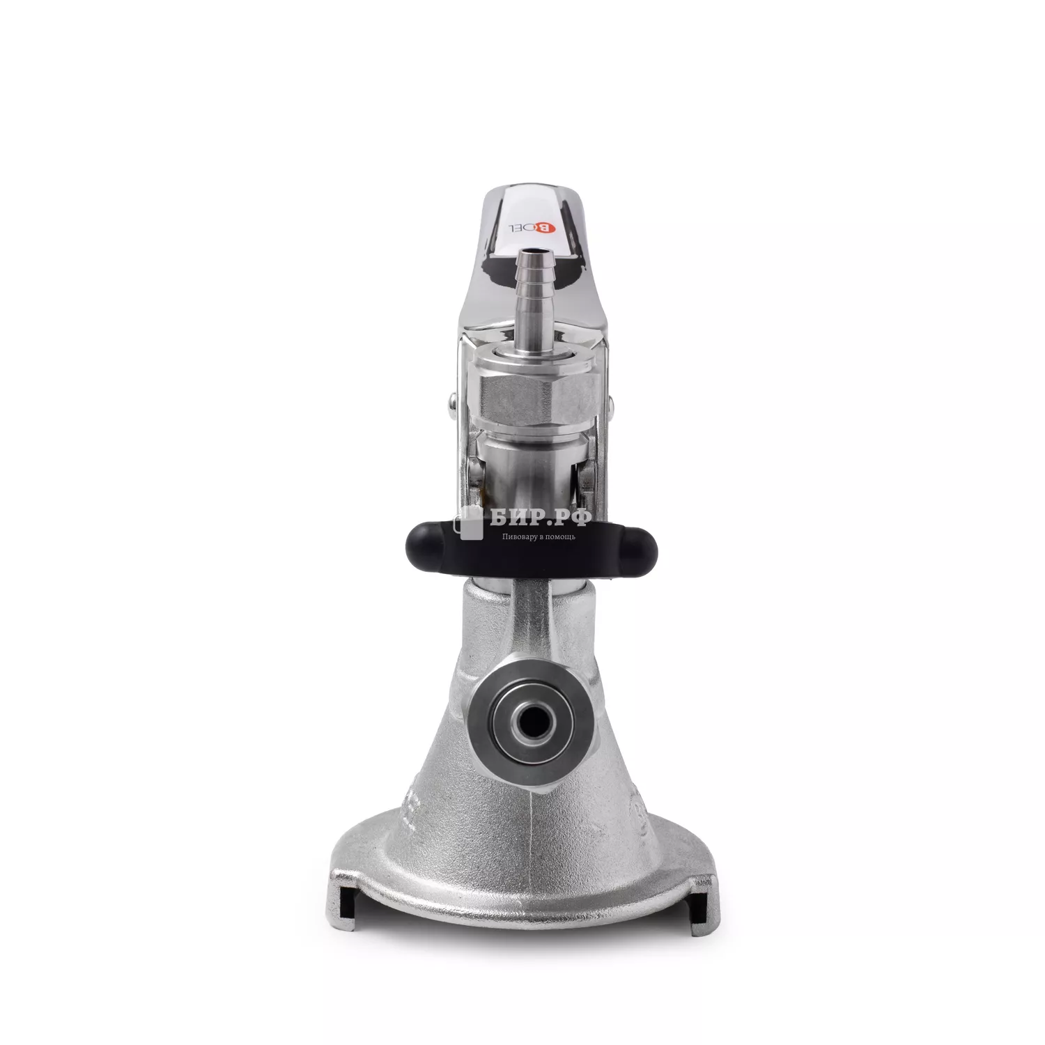 Чтобы установить заборную головку на КЕГ, нужно надеть ее на фитинг КЕГа так, чтобы юбка корпуса полностью его охватывала. Затем ручку необходимо опустить вниз, чтобы обеспечить надежное соединение. После этого газовая линия, подключенная к заборной головке, начинает подавать углекислоту или азотно-углекислотную смесь внутрь КЕГа. Это создает давление, которое позволяет напитку перемещаться и поступать в устройство розлива через пивную линию.