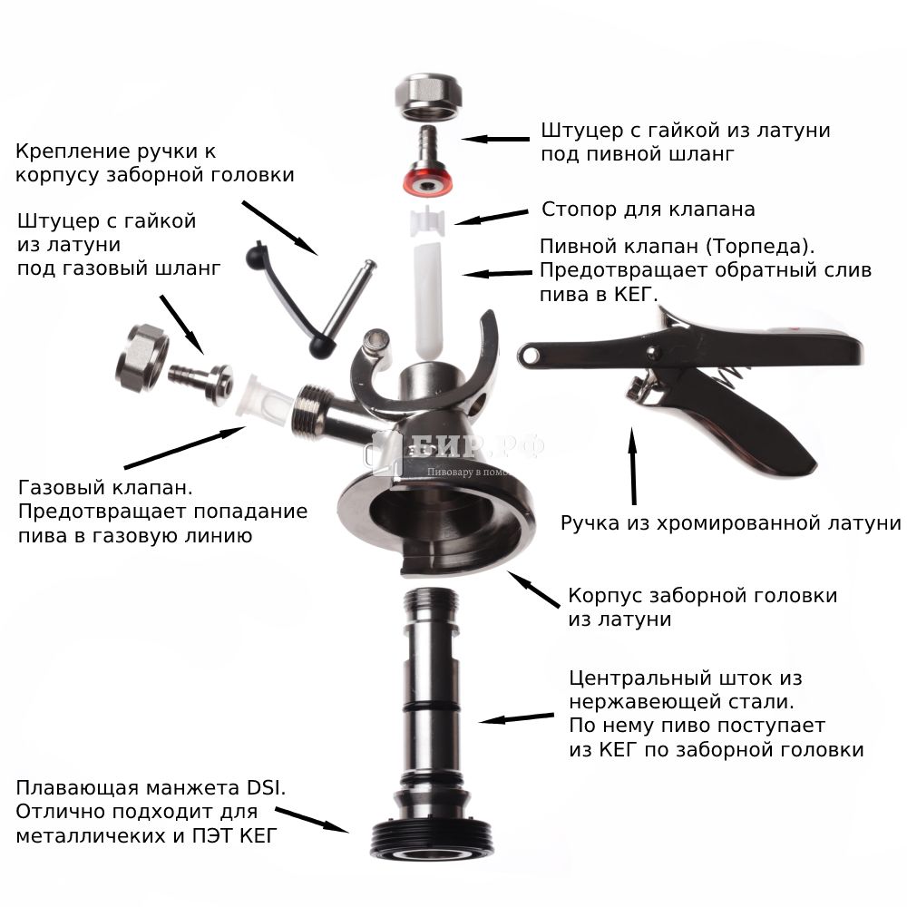 Заборная головка от Boel оснащена плавающей манжетой DSI, которая отлично выполняет свои функции, как в металлических, так и в пластиковых ПЭТ КЕГах (см. схему устройства ниже).