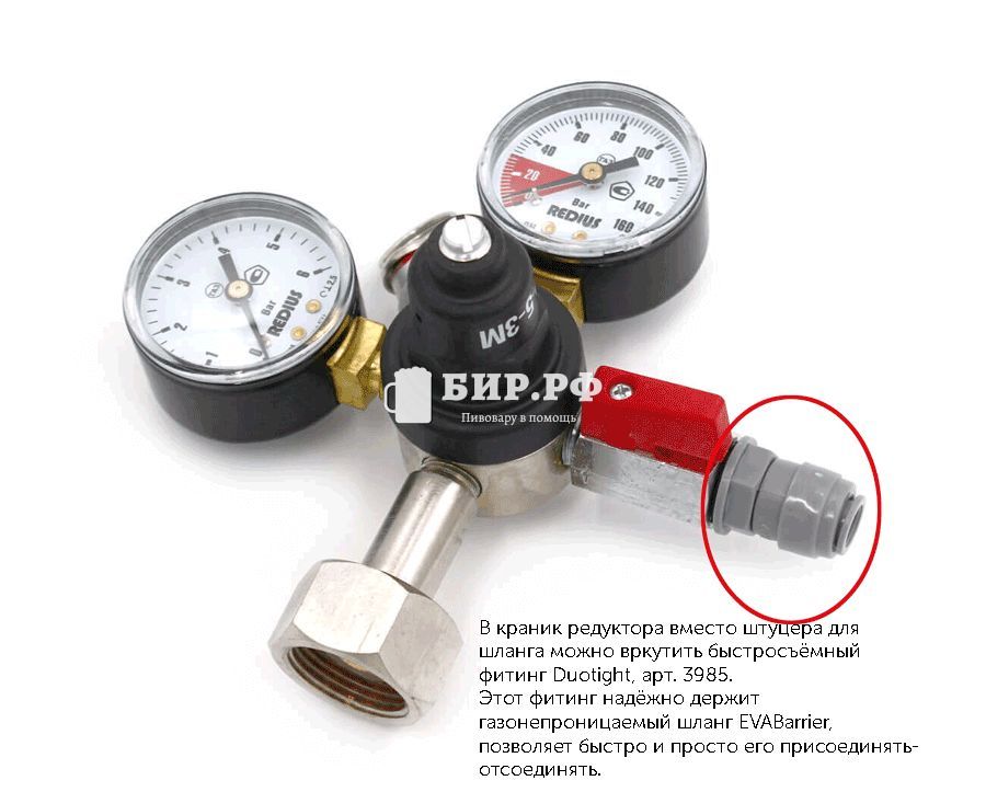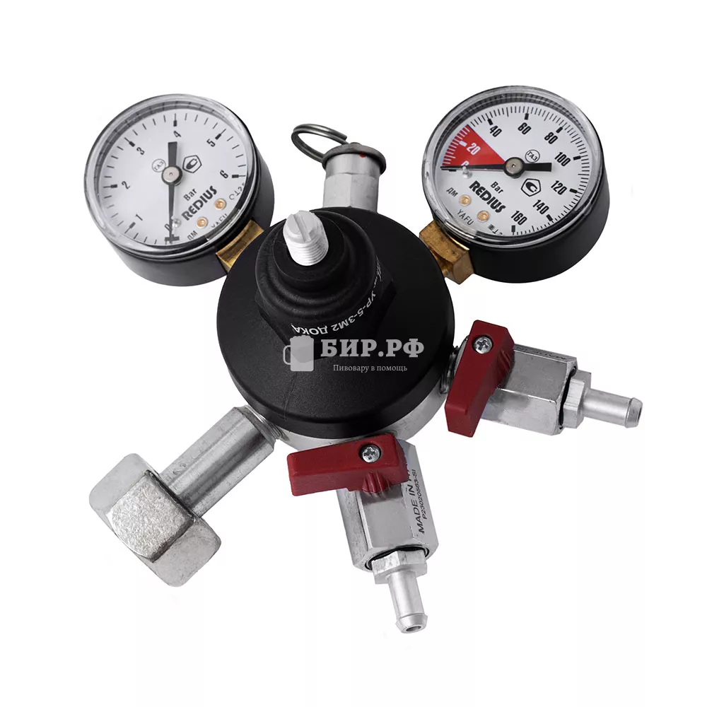 Пивной редуктор на два потока, предназначен для понижения и регулирования давления углекислого газа поступающего из баллона в линию розлива кеговых напитков (пива, лимонада, кваса, сидра, медовухи и др) и автоматического поддержания заданного давления на выходе редуктора. При подаче СО2 в кег, создается давление при помощи которого напиток попадает в пивной кран или пеногаситель, при этом газ насыщает пиво углекислотой. Редуктор оснащен предохранительным клапаном, который предотвращает попадание в него напитка.