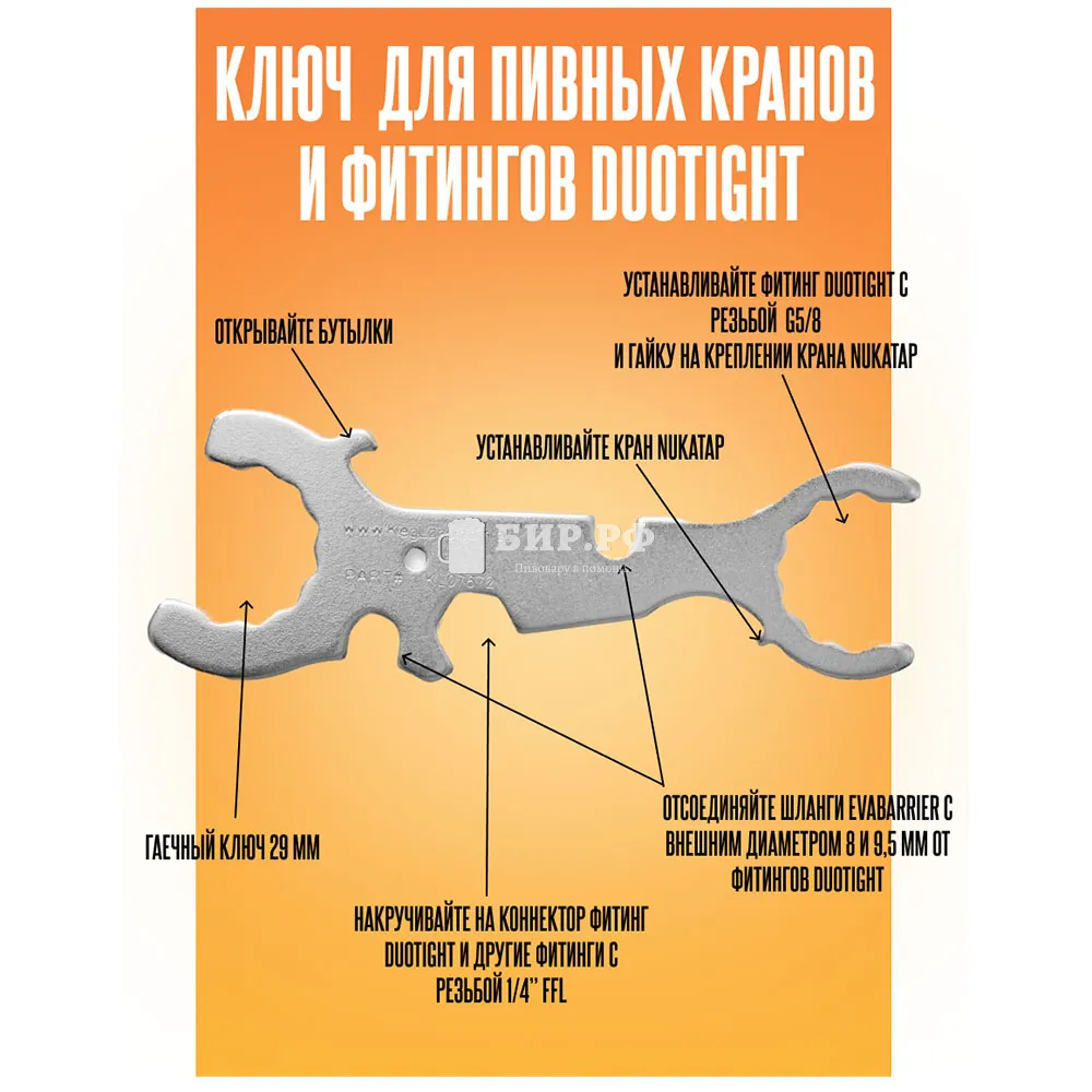 Ключ 7 в 1 для пивных кранов и фитингов Duotight представляет собой удобный и многофункциональный инструмент. С его помощью вы сможете легко отсоединять шланг EVABarrier, закручивать фитинги Duotight с резьбой G5/8 и 1/4 FFL, а также устанавливать кран Nukatap.