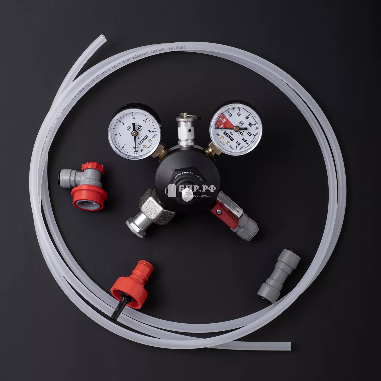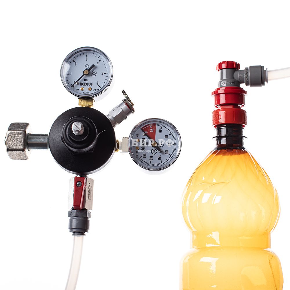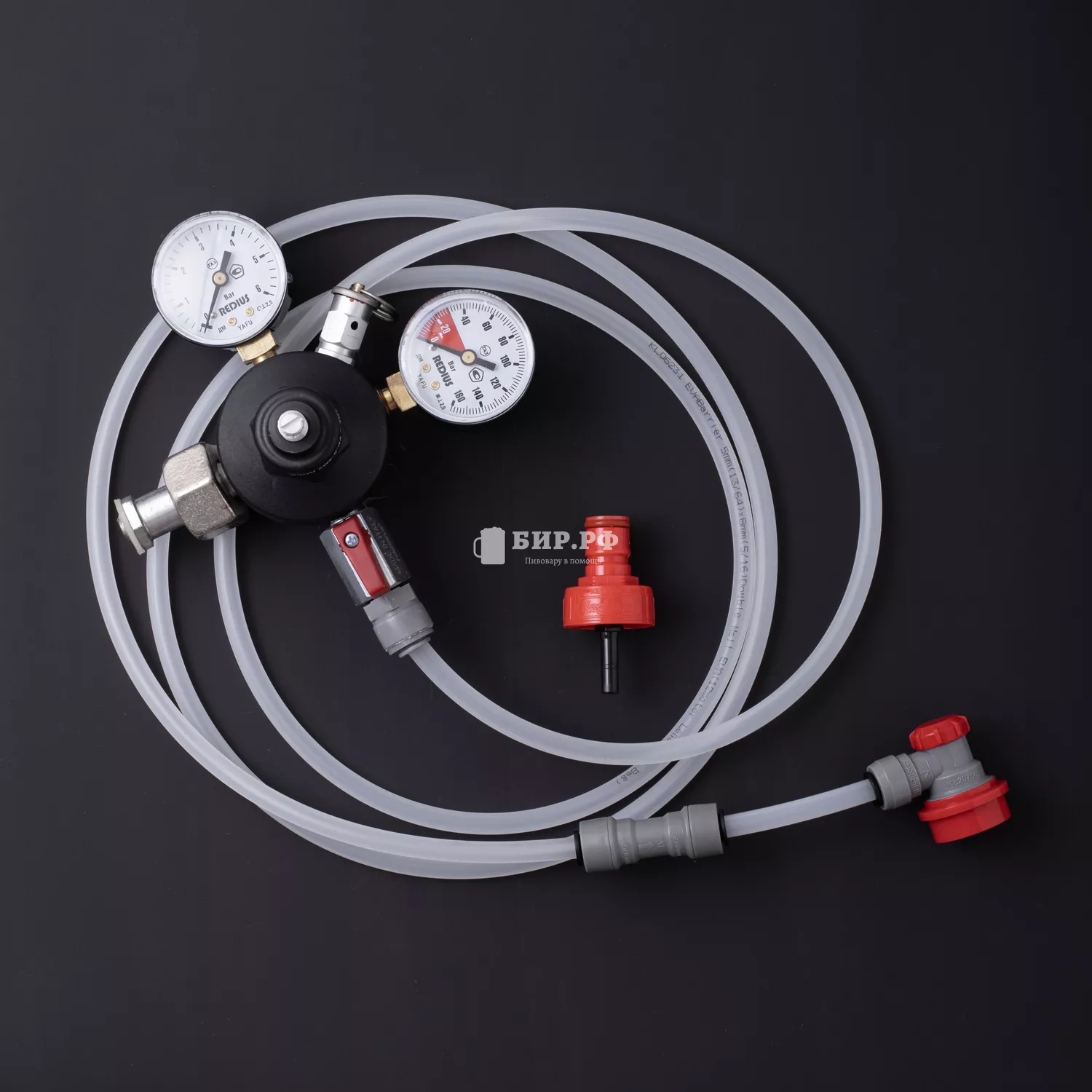 Комплект состоит из редуктора, крышки Ball Lock c резьбой для ПЭТ бутылки. газонепроницаемого шланга MDP, быстросъемных фитингов Duotight на редукторе и на коннекторе Ball Lock для подключение к крышки с бутылкой.