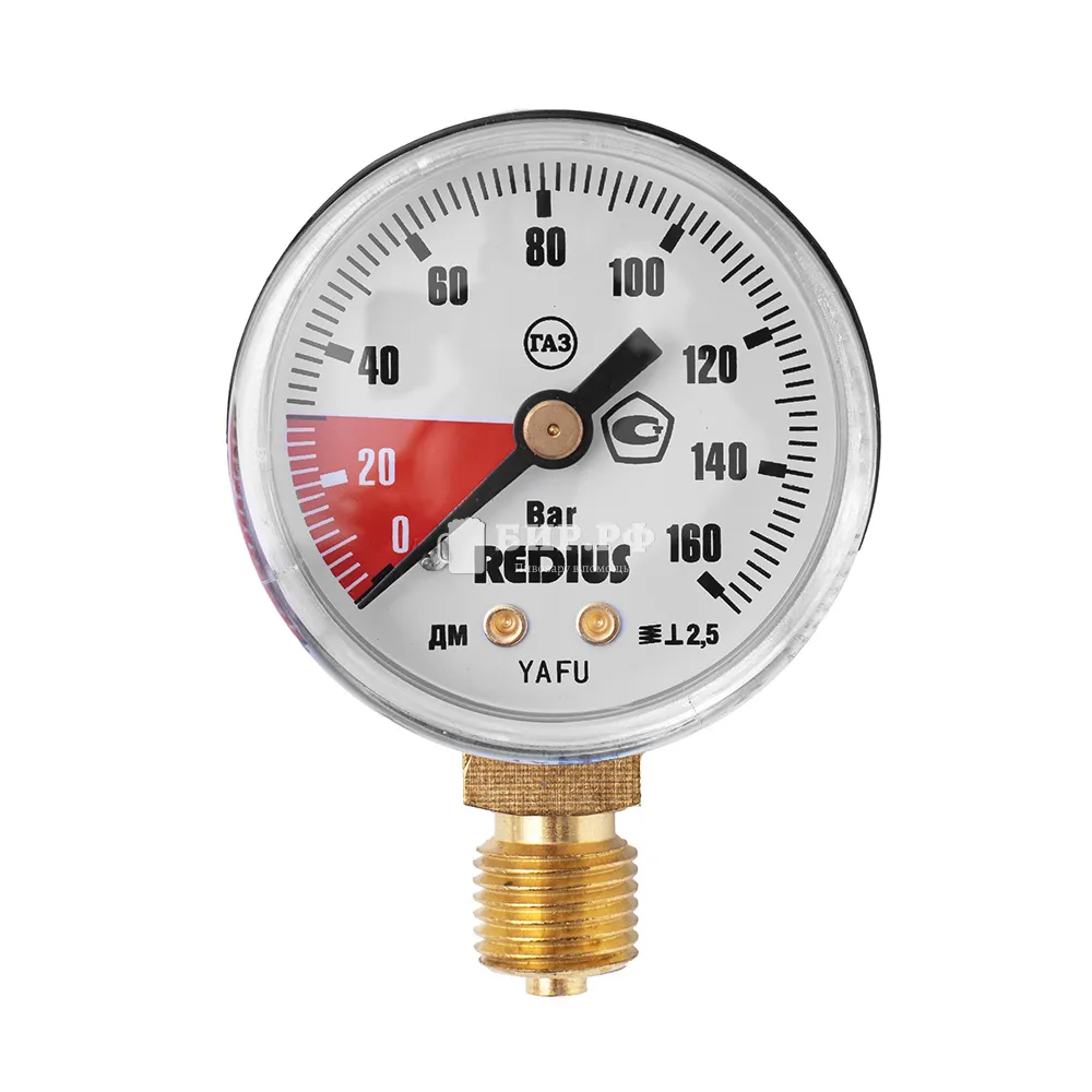 Редуктор предназначен для измерения давления в газовых баллонах в диапазоне от 0 до 160 бар с ценой деления 20 бар. На шкале манометра красным цветом выделена зона от 0 до 30 бар, которая сигнализирует о скором опустошение баллона.