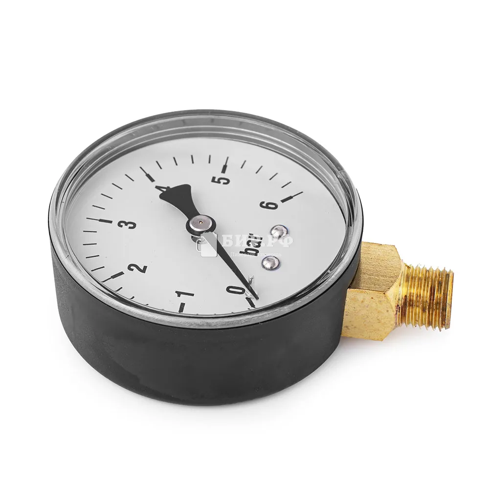 Циферблат этого прибора имеет диаметр 6 см и шкалу, размеченную в барах, а диапазон измерений составляет 0 до 6 бар. Четкая маркировка на шкале обеспечивает удобство при чтении показаний.