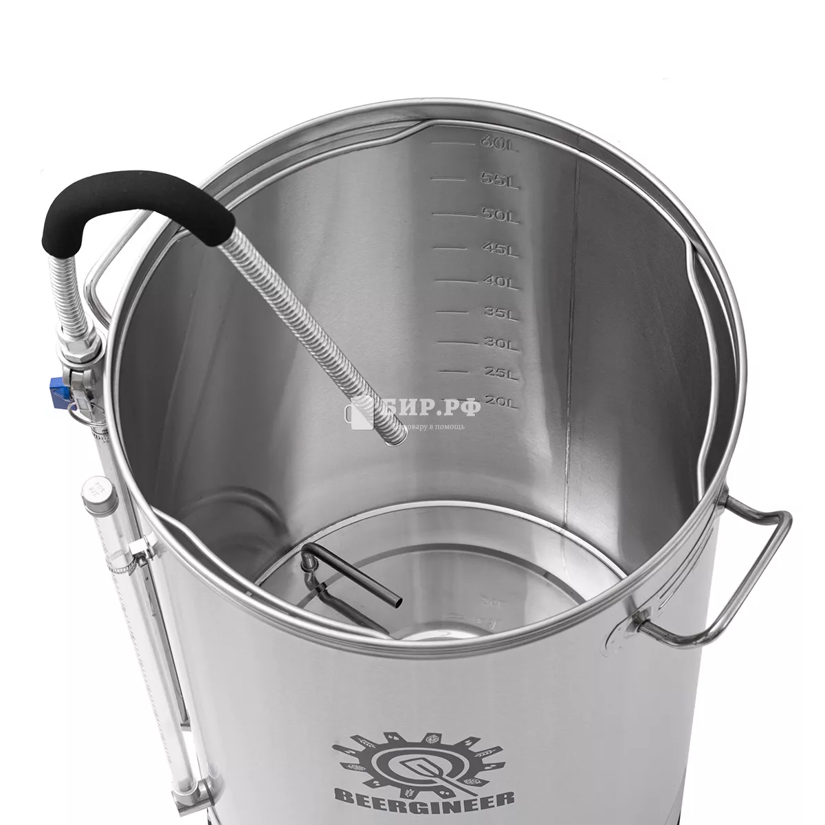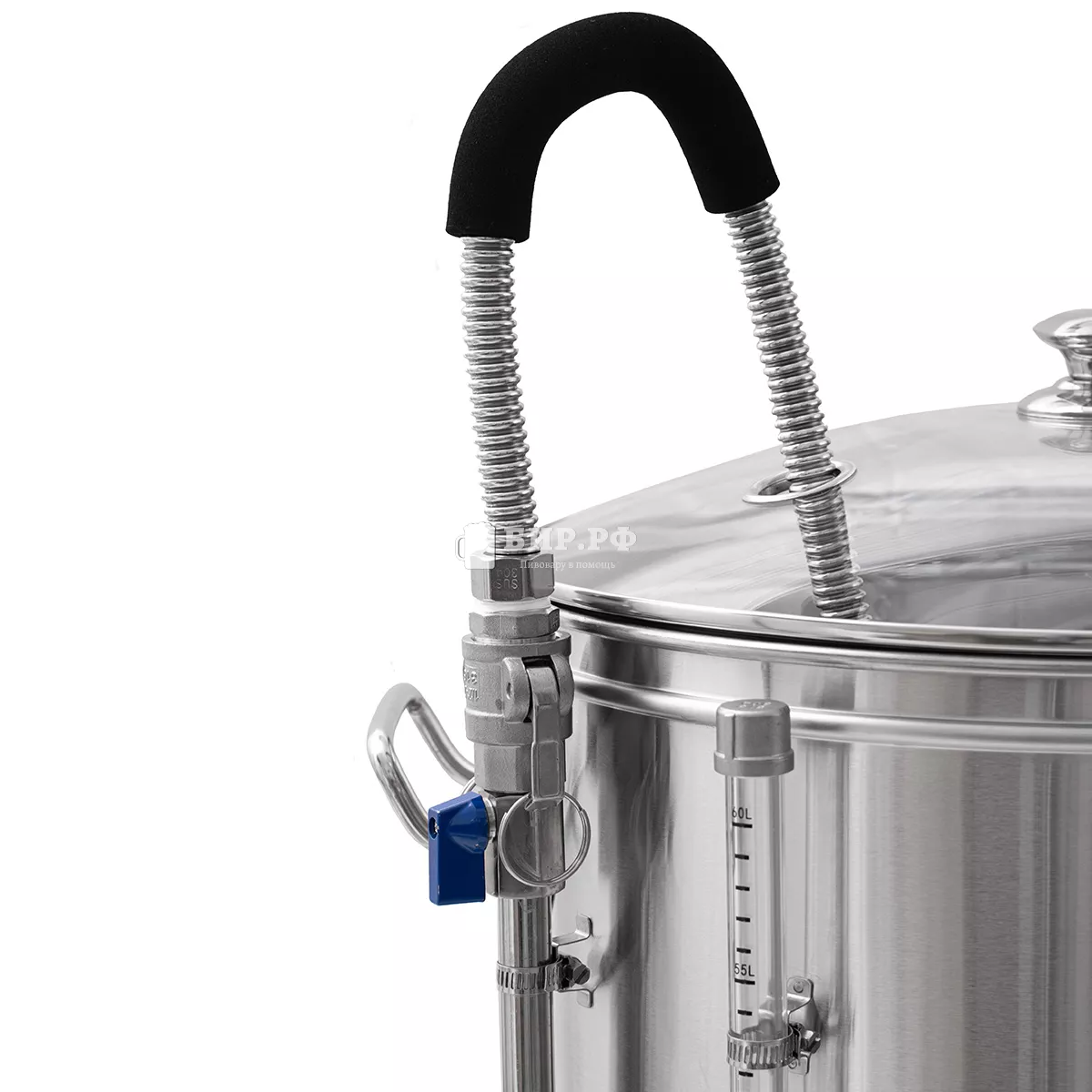 Нагрев происходит благодаря встроенному ТЭНу с плавной регулировкой мощности от 100 до 3500 Вт. Внутренний рециркуляционный насос отвечает за фильтрацию и перемешивание сусла, устраняя необходимость вручную перемешивать солод. Заборная трубка насосной системы обеспечивает защиту от твердых частиц, а фильтр-базука очищает сусло от хмеля после кипячения.