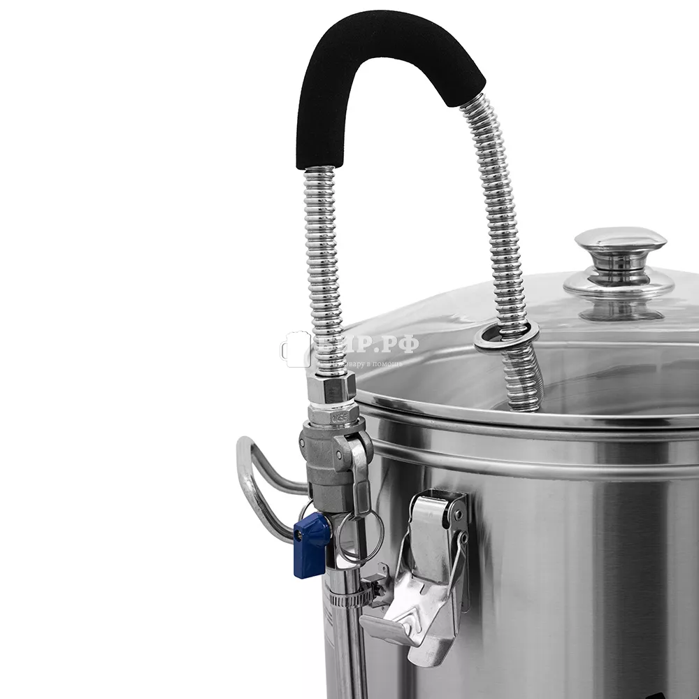 Нагрев происходит благодаря встроенному ТЭНу с плавной регулировкой мощности от 100 до 2500 Вт. Внутренний рециркуляционный насос отвечает за фильтрацию и перемешивание сусла, устраняя необходимость вручную перемешивать солод. Заборная трубка насосной системы обеспечивает защиту от твердых частиц, а фильтр-базука очищает сусло от хмеля после кипячения.