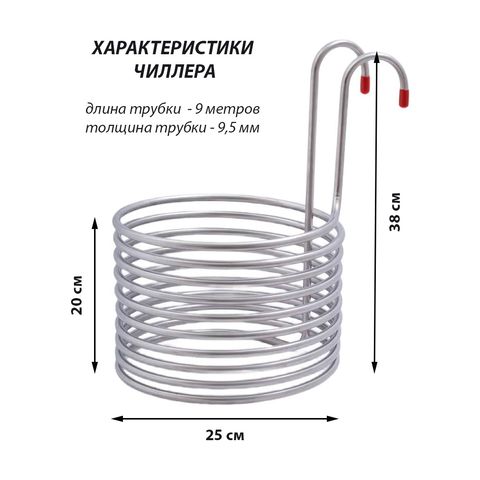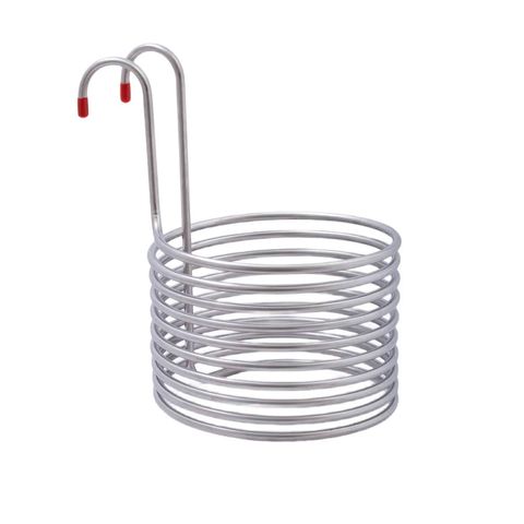 Охладитель сусла погружной / чиллер изготовлен из нержавеющей стали AISI 304 толщиной 1 мм. Длина трубки 9 м с наружным диаметром 9,5 мм. Он предназначен для охлаждения горячего сусла путем подачи проточной воды сквозь змеевик.