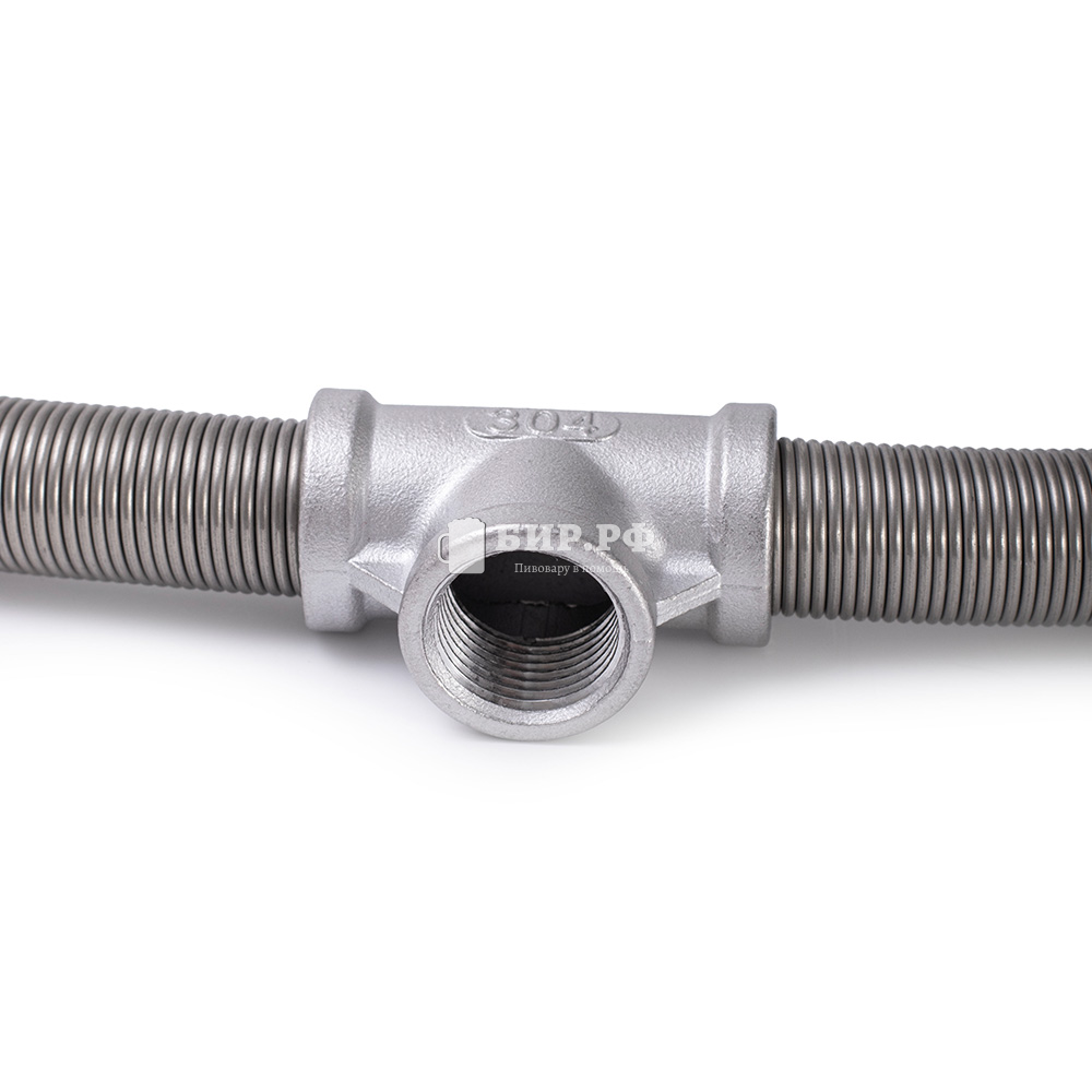 Спираль присоединяется к шаровому крану пивоваренной установки с помощью тройника из нержавеющей стали размером 1/2 дюйма, который ввинчивается непосредственно во внешнюю резьбу крана для сбора сусла непосредственно под отверстием шарового крана.