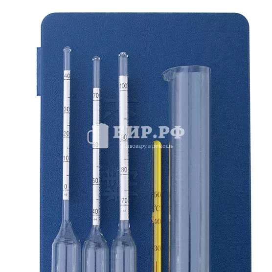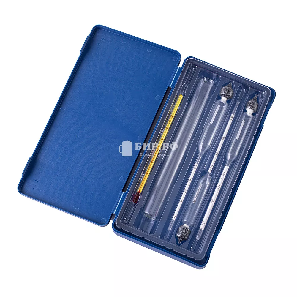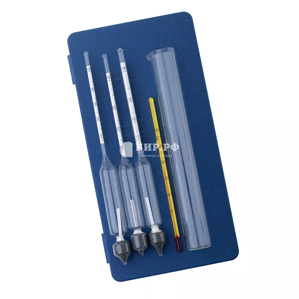 Набор из трёх спиртометров, термометра и цилиндра в пластиковом футляре — это удобный и практичный инструмент для измерения объёмной доли этилового спирта в негазированных водных растворах — дистиллятах и ректификатах.
