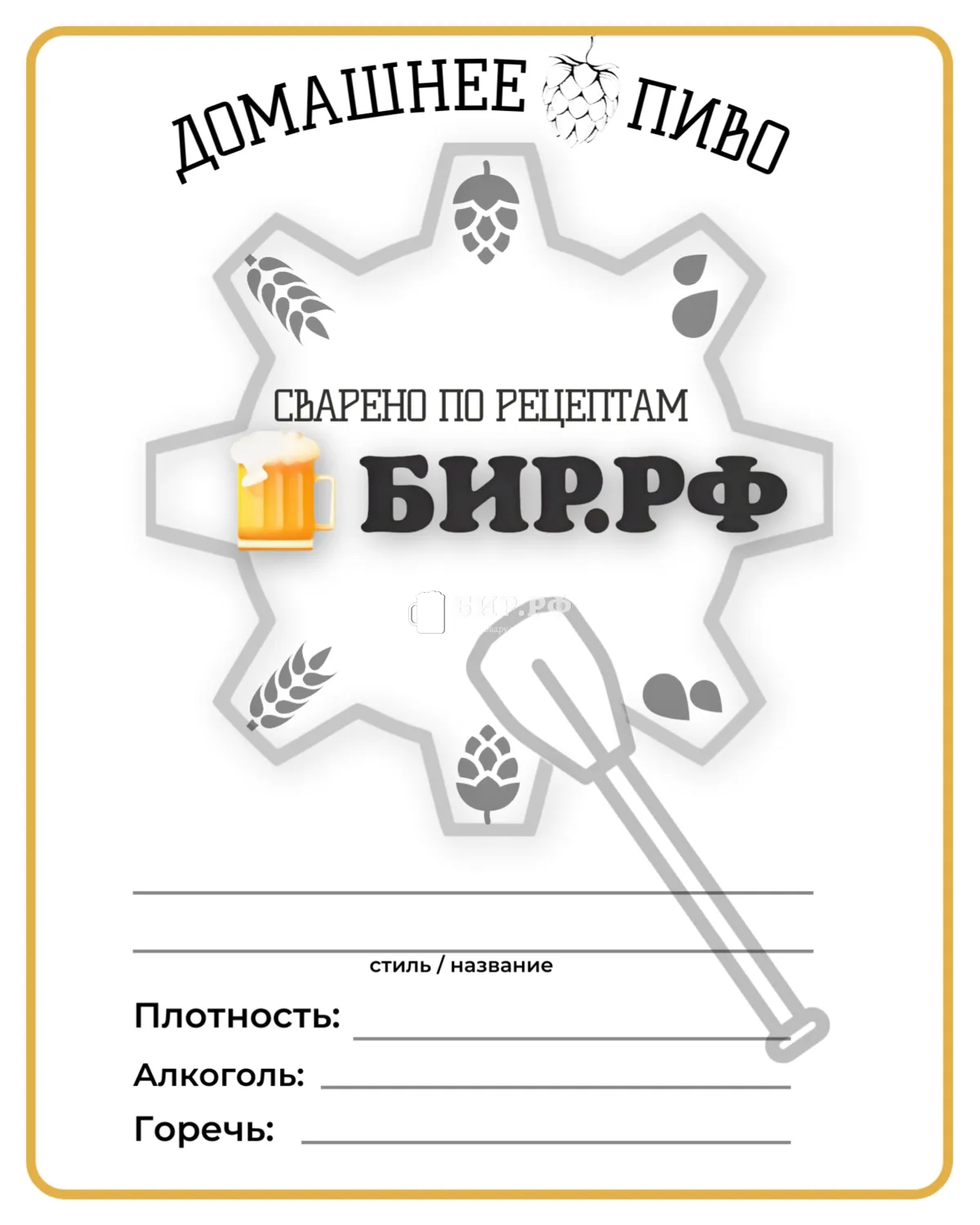 Самоклеящаяся этикетка "Сварено по рецептам Бир.РФ" размером 70*100 мм предназначена для оформления стеклянных и пластиковых ПЭТ бутылок с пивом.