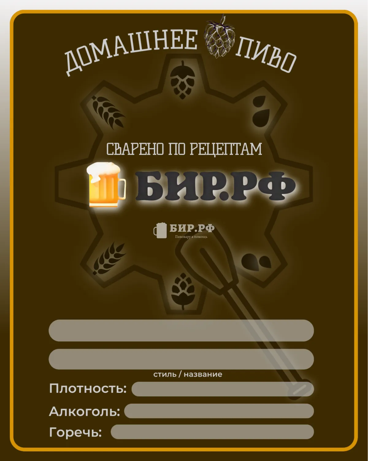 Самоклеящаяся этикетка "Сварено по рецептам Бир.РФ" размером 70*100 мм предназначена для оформления стеклянных и пластиковых ПЭТ бутылок с пивом.