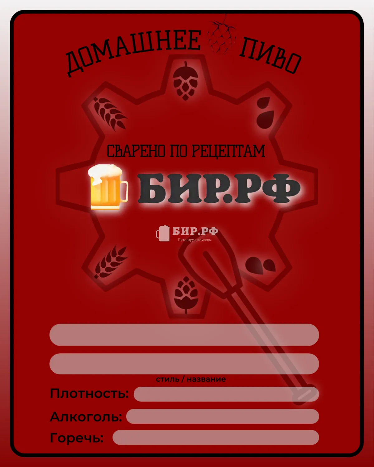 Самоклеящаяся этикетка "Сварено по рецептам Бир.РФ" размером 70*100 мм предназначена для оформления стеклянных и пластиковых ПЭТ бутылок с пивом.