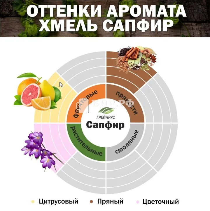 Сапфир относится к категории благородных ароматных хмелей. Он обладает пониженным уровнем когумулона (в пределах 12-17% от альфа-кислот) и обеспечивает мягкую горчинку. Его профиль представляет собой сбалансированное сочетание пряных, цветочных и фруктовых нот.