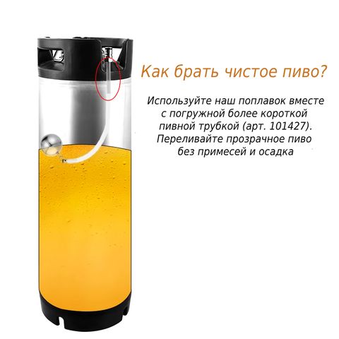 Чтобы превратить корнелиус кег в ферментер для брожения, к средней пивной погружной трубки, которую можно заменить в корнелиус кеге вместо стандартной длинной трубки, можно присоединить наш поплавок с шлангом, что позволит переливать чистое отбродившее пиво не захватывая осадок со дна кеги.