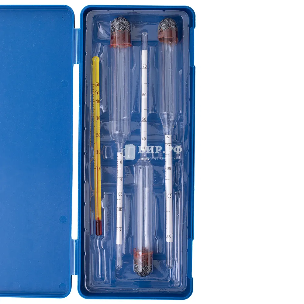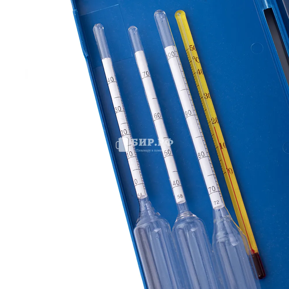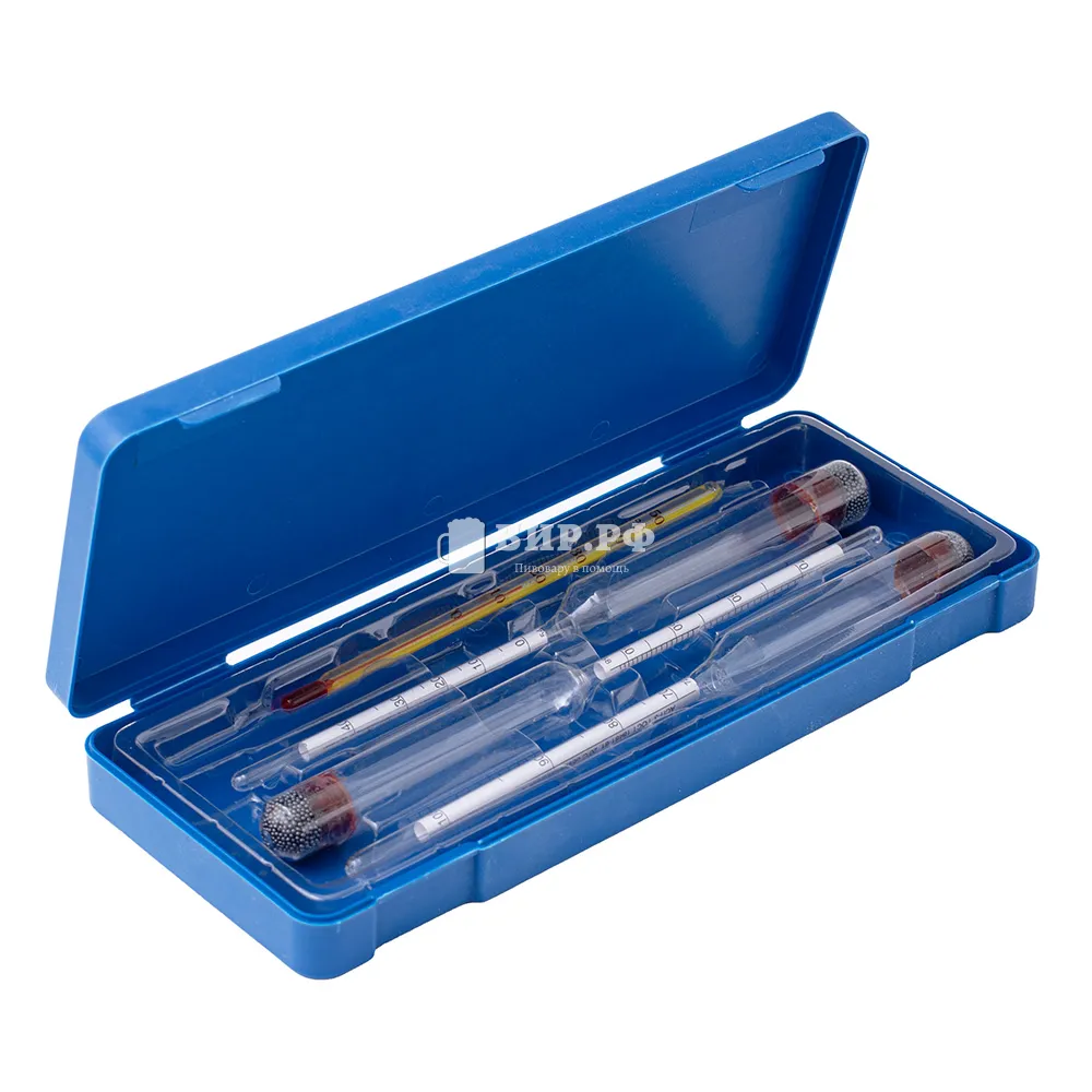 Набор из трёх спиртометров и термометра в пластиковом футляре Hoppy Brew — это удобный и практичный инструмент для измерения объёмной доли этилового спирта в негазированных водных растворах — дистиллятах и ректификатах.