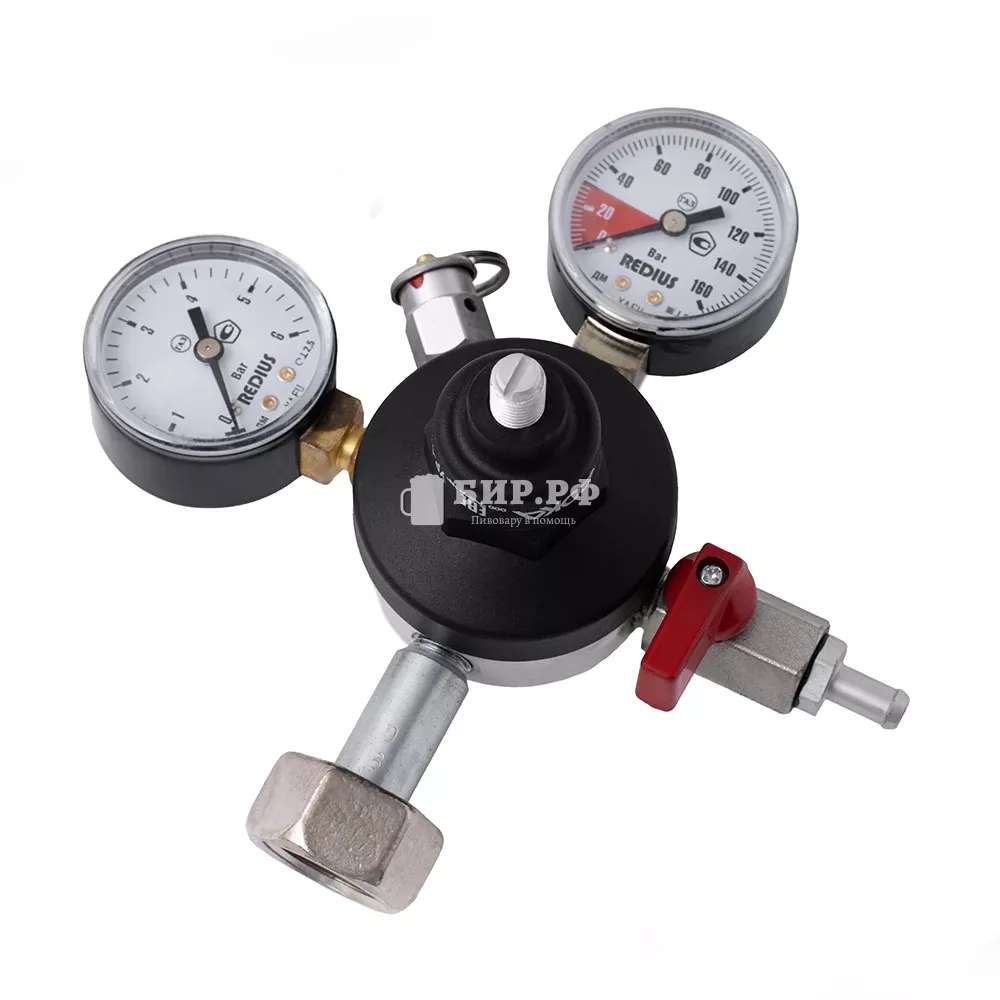 Редуктор углекислотный с краном "Redius" представляет собой газовый редуктор на один поток. Он присоединяется к баллону с помощью гайки G3/4, а на выходе имеет кран со штуцером диаметром 8,5 мм.