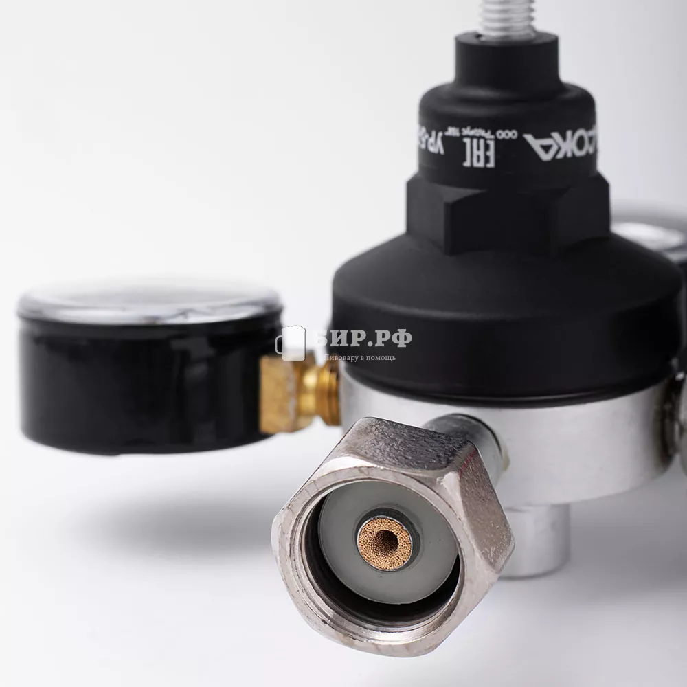 Главная задача этого редуктора - понижение и регулировка давления углекислого газа, который поступает из баллона. Он также автоматически поддерживает постоянное рабочее давление газа на выходе. Редуктор оснащен предохранительным клапаном, который предотвращает попадание напитка в редуктор. Он применяется в основном в процессе розлива газированных напитков.