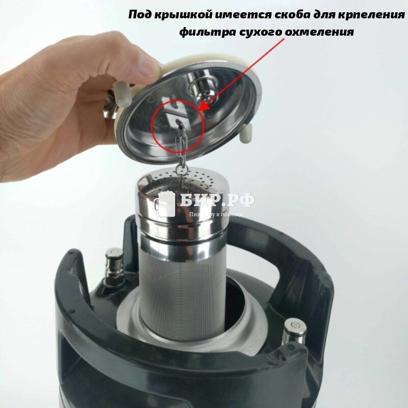 На внутренней стороне крышки имеется скоба для крепления фильтра сухого охмеления, что позволяет пивовару добавлять ароматические ингредиенты во время процесса. Каждый кег имеет маркировку на корпусе, включающую характеристики и номер партии, что облегчает идентификацию и отслеживание.